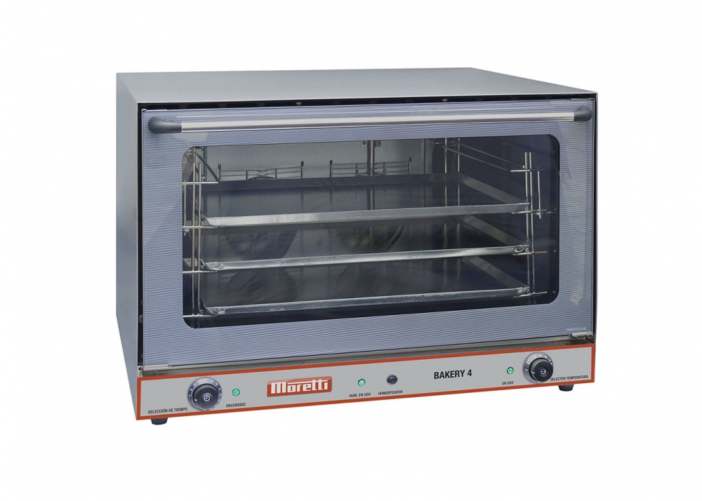 > DESCRIPCIÓN Ideal para restaurantes, hoteles, estaciones de servicio y supermercados. Alta calidad de cocción gracias a su doble resistencia y ventilador. 4 bandejas de cocción (incluidas). Muy simple de operar, instalar y mantener. Construido íntegramente en acero inoxidable. Función HUMIDIFICADOR de VAPOR de acción manual.