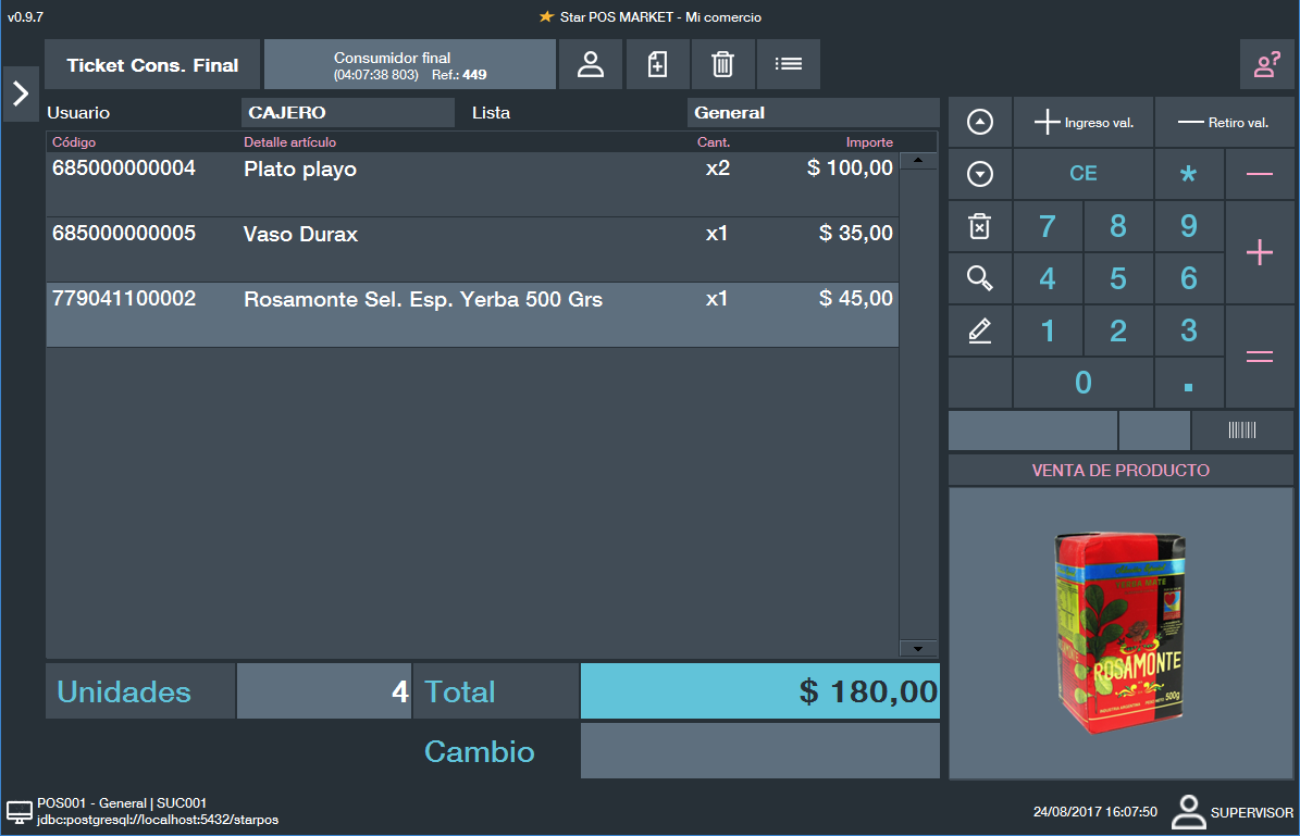 Descripción: StarPOS Market es un sistema de gestión y de punto de ventas orientado a una gran variedad de comercios minoristas, como supermercados, autoservicios, minimarkets, heladerías, carnicerías, joyerías, entre muchos otros rubros más. StarPOS Market permite tener en una misma PC funcionalidades de Backoffice (agregar productos, clientes, usuarios, modificar precios, etc.) y funcionalidades de Checkout o caja (vender/facturar). Conectividad con: Impresoras fiscales de 1ra y 2da generación Comanderas Scanners Balanzas RS-232 Cajas registradoras Lectores de tarjetas Balanzas emisoras de etiquetas de códigos de barra Impresores de etiquetas